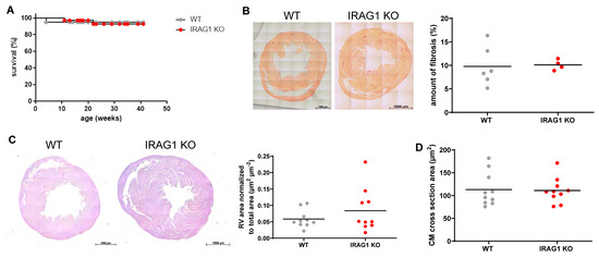Disruption of IRAG1 gene in mice showed no obvious sign of mortality, increment in right ventricular (RV) fibrosis and area, and cardiomyocytes area. (A) Kaplan–Meier analysis was performed to analyze the difference of survival between the two groups. (B) Sirius red staining was performed to analyze fibrosis in mice heart and further quantified. Bars indicate 1000 µm. (C,D) H & E staining was performed with mice heart to analyze RV (C) and cardiomyocytes area (D) and further quantified. Bars indicate 1000 µm. Number of animals used: (A) 20 WT and 35 IRAG1 KO, (B) 6 WT and 4 IRAG1 KO, (C) 10 WT and 10 IRAG1 KO, (D) 10 WT and 10 IRAG1 KO. All quantified data were represented as individual point and bar indicated the mean, two-tailed unpaired t-Test.