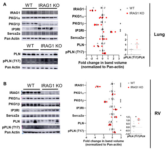 IRAG1-deficient mice had endogenous dysregulation of PKGIβ in lung and RV (A,B) Western blots of protein lysates isolated from WT and IRAG1 KO mice lungs (A) and right ventricles (B). Representative blot pictures are on the left and subsequent lognormal values of densitometry quantifications are on the right. Densitometry was performed in the same blot pictures as presented here and n number corresponds to different animals in the same experiment. Number of animals used: (A) Lungs from four WT and five IRAG1 KO mice; lungs from four WT and four IRAG1 KO mice for PLN and Ppln (T17); (B) right ventricles from five WT and five IRAG1 KO mice. Primary antibodies used in western blots were IRAG1, PKG1α, PKG1β, IP3RI, Serca2a, Phospholamban (PLN), and phospho-Thr17 Phospholamban [pPLN (T17)]. Pan-actin was used as housekeeping gene. Fold change was calculated in relation to normoxic controls. All the western blot data were represented as individual point and bar indicates the mean, * p < 0.05, ** p < 0.01, *** p < 0.001, ****p < 0.0001, two-tailed unpaired t-Test.
