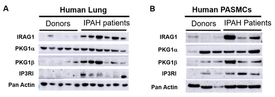 IRAG1 and PKGIβ had stronger expression in lungs and isolated pulmonary artery smooth muscle cells (PASMCs) from end stage IPAH patients. (A,B) Western blots of protein lysates isolated from human lung homogenate (A) and human PASMCs (B). (A) 5 Donors and 6 IPAH patients lung samples were used. (B) 3 Donors and 3 IPAH patients PASMCs were used. Primary antibodies used in western blots were IRAG1, PKG1α, PKG1β, and IP3RI. Pan-actin was used as housekeeping gene.