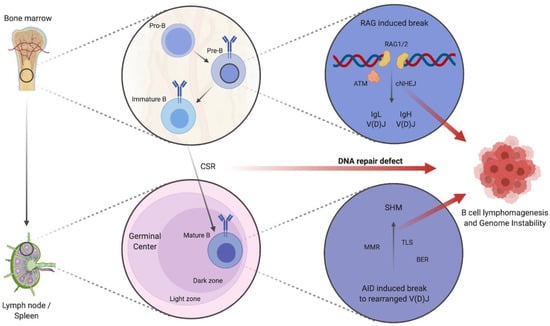 Schematic depiction of B cell development and impaired DNA repair contributing to B cell lymphomagenesis and increased genome instability. Schematic figure depicting the maturation of pro-B cells to immature B cells in the bone marrow by cNHEJ mediated IgL and IgH V(D)J. CSR and consequent SHM of mature B cells in the dark zone of GCs is mediated by further DNA repair mechanisms: e.g., MMR, BER, and TLS. Defects in DNA repair pathways contribute to B cell lymphomagenesis and lead to genome instability with the increased occurrence of translocations, fusions, deletions, or breaks/gaps. Abbreviations: IgL: immunoglobulin light chain, IgH: immunoglobulin heavy chain, V(D)J: variable (V), diversity (D), and joining (J) gene segments, cNHEJ: classical non-homologous end joining, ATM: ataxia telangiectasia mutated, CSR: class switch recombination, SHM: somatic hypermutation, MMR: mismatch repair, BER: base excision repair, TLS: trans-lesion synthesis, AID: activation-induced cytidine deaminase, RAG1/2: recombination-activation gene 1/2. Created with BioRender.com.