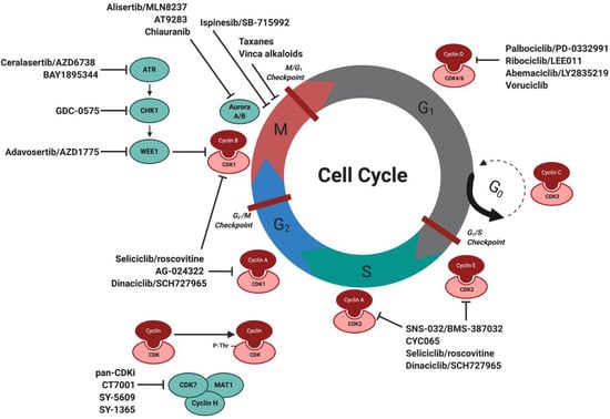 Based on the extensive knowledge on the cell cycle and genetic aberrations of cell cycle-related genes in B cell lymphomas, we are now in a position to explore treatment options that directly or indirectly target the cell cycle, of which the most recent and/or common treatments are summarized in Figure 2. As of today, many clinical trials are underway for CDK4/6 inhibitors, such as palbociclib/PD-0332991 (phase 2 in MCL), abemaciclib/LY2835219 (phase 2 in refractory/relapsed MCL), ribociclib/LEE011 (phase 1 in lymphomas), and voruciclib (phase 1 in relapsed/refractory MCL, B cell malignancies and AML). Promising results were also seen for palbociclib combined with BTK inhibitor ibrutinib [] and proteasome inhibitor bortezomib in MCL [], and combined with DNA damage-inducing treatments such as irradiation [] or WEE1 inhibitor AZD1775 [] in other cancers. Further investigation showed that CDK4/6 inhibition has the ability to shift the DDR response from HR to cNHEJ [], in addition to reducing PARP1 expression levels [], making it a potential candidate to use alongside DNA repair inhibitors or cancers with DNA damage deficiencies. Inhibitors that target CDK1/2 currently under investigation include dinaciclib/SCH727965 (phase 1 in MCL and non-Hodgkin lymphomas, NHL) and AG-024322 (phase 1 in NHL), in addition to specific CDK2 inhibitors SNS-032/BMS-387032 (phase 1 MCL and advanced B-lymphoid malignancies) and CYC065 (phase 1 in refractory/relapsed CLL). Besides specific CDK inhibitors, pan-CDK inhibitors such as alvocidib/flavopiridol (phase 1/2 in MCL and DLBCL), P276-00 (phase 2 in refractory/relapsed MCL), and AT7519M (phase 2 in refractory/relapsed MCL) are under investigation that target multiple CDKs at the same time, including CDK7 (part of the Cdk-activating kinase (CAK) complex) and CDK9 (part of the multiprotein elongation factor complex for RNA polymerase II). Pre-clinical experiments with CDK1/2 inhibitor seliciclib/roscovitine revealed that treatment of MCL cells resulted in cell cycle arrest at the G2/M phase followed by apoptosis, in addition to causing downregulation of cyclin D1 and MCL-1 protein levels []. Similar effects were induced in MCL by alvocidib [], which also showed efficacy combined with bortezomib in MCL []. Moreover, alvocidib has been shown to enhance the radiosensitivity of ovarian carcinoma cells [], likely caused by its ability to bind to DNA [], making it another interesting compound for combination with DNA repair inhibitors. Other treatment options that target the cell cycle include inhibitors for aurora kinase A/B, with clinical trials on-going for alisertib/MLN8237 (phase 1 in MCL and NHL), AT9283 (phase 1 in NHL) and chiauranib (phase 1 in NHL), inhibitors for WEE1 with adavosertib/AZD1775 (phase 2 in NHL), and inhibitors for kinesin spindle protein (KSP) with ispinesib/SB-715992 (phase 1 in NHL). Research in other cancers has shown that treatment of ovarian carcinoma cells with alisertib decreased the expression of PARP and BRCA1/2 and enhanced DNA-PKcs activity, stimulating cNHEJ over HR [] and showed synergism with CHK1 inhibitor rabusertib/LY2603618 []. In addition, alisertib showed promising results combined with docetaxel in MCL [], further expanding its therapeutic potential. The observation that many cell cycle inhibitors alter the DDR, either by tilting the balance towards cNHEJ over HR or by directly influencing DDR protein expression levels, gives us novel therapeutic options. These may thus focus on the simultaneous targeting of both the DRR and cell cycle, especially in B cell lymphomas with additional DDR deficiencies.