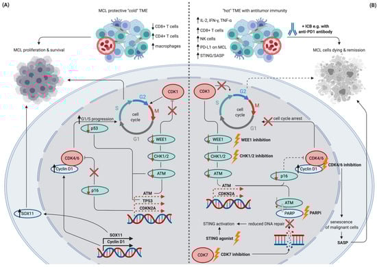 This feature of cyclin D1 overexpression is reversed by CDK4/6 inhibition, which results in increased antitumor immunity due to enhanced CD8+ T cell infiltration and activity with increased IL-2 secretion in lung cancer mouse models []. An improved antitumor immune response was also observed with the CDK4/6 inhibitor abemaciclib in a transgenic breast cancer mouse model []. By suppressing DNMT1 expression, abemaciclib leads to the expression of endogenous retroviral elements by the malignant cells and ultimately resulted in increased ICB responsiveness due to higher interferon and MHC-I signaling []. Similar observations were made in syngeneic mouse models and samples derived from melanoma patients [,]. Interestingly, CDK4/6 inhibition induces senescence of malignant cells activating senescence-associated secretory phenotypes (SASP) induced by NF-κB and STAT3 signaling, consecutively resulting in increased antitumor immunity [,]. In contrast, SASP induces recruitment and activation of immune effector cells such as NK cells, macrophages, and CD8+ T cells limiting tumor growth in tumors with p53 WT, activated MYC, active Wnt, and low Notch signaling. Such a SASP pattern is observed in the context of CDK4/6 inhibition in KRAS-mutant lung and pancreatic cancer models, leading to an effective antitumor immune response []. Importantly, alternative SASP may facilitate tumor growth by inducing a state of chronic inflammation establishing an immunosuppressive TME in tumors with p53 mutations or activated Notch signaling. Targeting the cell cycle machinery beyond CDK4/6, a recent study found enhanced ICB sensitivity due to increased CD4+ and CD8+ T cell immunity with CDK7 inhibition in small cell lung cancer models []. While these studies investigated solid tumor models, they provide a mechanistic rationale to investigate ICB combinations with CDK inhibitors in DDR deficient B cell lymphomas such as MCL.