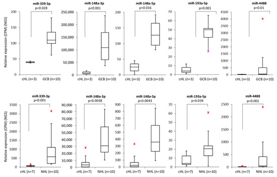 - max. outlier. (B): miR-148a-3p downregulation in microdissected HRS cells from cHL cases (n = 10) in comparison to cHL cell lines (n = 7), NHL cell lines (n = 10) and GCB 77+ cell pools from tonsillectomy specimens of chronic hyperplastic tonsillitis (n = 10) (p < 0.05);
