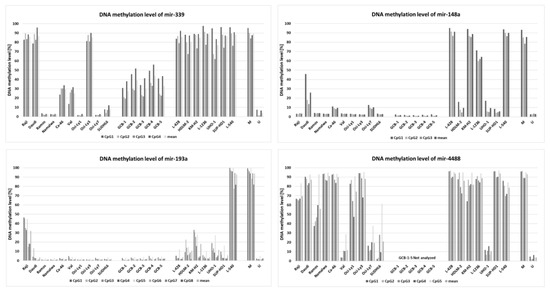 As cHL is defined by a unique miRNA expression profile distinct from other B-cell lymphomas, one can expect the presence/absence of driver miRNAs having significant influence on cHL pathogenesis [26,27]. Following this lead, we have analyzed whether miRNAs found downregulated in cHL cell lines in our parallel study (our unpublished results, manuscript in preparation) have their promoter region located within or <1000 bp from a CpG island. We assumed that this is a strong indication that these miRNAs are epigenetically regulated and their DNA methylation level should be evaluated.