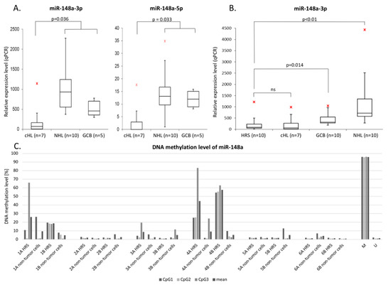(A): Validation of mir-148a-3p/5p downregulation by real-time qPCR in cHL cell lines (n = 7) in comparison to NHL cell lines (n = 10) and GCB 77+ cell pools from tonsillectomy specimens of chronic hyperplastic tonsillitis (n = 5) (p < 0.05);