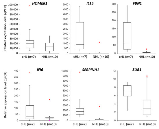 Overexpression of mir-148a putative target genes (HOMER1, IL15, FBN1, IFI6, SERPINH1 and SUB1) in cHL cell lines (n = 7) as compared to NHL cell lines (n = 10) (real-time qPCR);