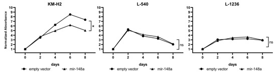 Lastly, in an attempt to understand the biological effect of the observed downregulation of mir-148a-3p/5p in cHL cell lines and microdissected HRS cells, we established three cHL cell lines (KM-H2, L-1236 and L-540) with stable mir-148a overexpression. Functional assays revealed the involvement of these miRNAs in negative regulation of proliferation in the KM-H2 cell line. We can only speculate that the composition of genetic alterations in the KM-H2 cell line makes it more sensitive to mir-148a overexpression than in the L-1236 and L-540 cell lines.