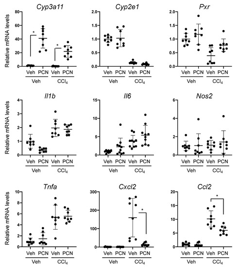 Effect of PCN treatment on the hepatic mRNA levels in CCl4-treated mouse. The total RNA from the mouse livers illustrated in Figure 1 was subjected to quantitative reverse transcription polymerase chain reaction (qRT-PCR). The mRNA levels of the target genes were normalized to 18S rRNA levels and are shown as relative values with that of the vehicle-treated mice as 1. Data are presented as mean ± SD with the plots of individual mouse data (n = 8). * p < 0.05 (Student’s t-test).