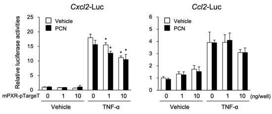 The influence of pregnane X receptor (PXR) activation on Ccl2 and Cxcl2 expression. 293T cells were transfected with Cxcl2-Luc or Ccl2-Luc, mPXR-pTargeT or control pTargeT, and control phRL-TK (total DNA: 100 ng/well) and then treated with 10 µM PCN or vehicle (0.1% dimethyl sulfoxide, DMSO) in combination with or without 10 ng/mL tumor necrosis factor-α (TNF-α) or vehicle (0.1% DMSO) for 24 h, and reporter activity was determined. Relative activity is shown compared to that in the cells transfected with control pTargeT (mPXR-pTargeT: 0 ng) and treated with vehicle only (the left-end open bar) as 1. Values are presented as mean ± SD (n = 4). Statistical differences within the TNF-α-treated groups were analyzed using one-way analysis of variance (ANOVA) followed by Dunnett’s test with the vehicle-treated cells with no PXR expression (the far-left column) as a control group. * p < 0.05.