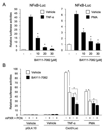 Using the Cxcl2 gene as a model, we next investigated the molecular mechanism of mPXR-mediated suppression. As several reports showed a mutual repression of PXR and NF-κB [19,20,21], we investigated whether mPXR suppressed the NF-κB-mediated transcription of Cxcl2. To this end, we first assessed NF-κB function in our reporter assay system. The assays were performed using a reporter plasmid containing NF-κB-responsive elements (Figure 4A). Reporter activity was upregulated by TNF-α or PMA treatment. This upregulation was suppressed by treatment with the NF-κB inhibitor BAY11-7082 in a dose-dependent manner. BAY11-7082 is known to inhibit NF-κB activation by inhibiting the phosphorylation of IκBα, NF-κB inhibitor α, by IκBα kinase and its degradation [22]. These results suggest that NF-κB is functional in our experimental system.