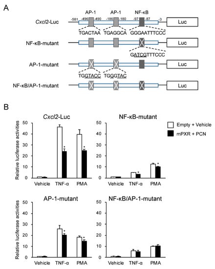 Effect of the mutation of NF-κB and activator protein 1 (AP-1) binding sites on the PXR-dependent suppression of Cxcl2 expression. (A) Schematic representation of the reporter constructs is shown. Underlines indicate the mutated nucleotides. (B) 293T cells were transfected with each reporter plasmid shown in A, mPXR-pTargeT or control pTargeT, and control phRL-TK (total DNA: 100 ng/well). The cells were treated with 10 ng/mL TNF-α, 10 nM PMA, or vehicle (0.1% DMSO) in combination with or without 10 µM PCN or vehicle (0.1% DMSO) for 24 h, and reporter activity was determined. Relative activity is shown compared to that in the cells transfected with empty pTargeT and treated with vehicle only (the left-end open bar) as 1. Values are presented as mean ± SD (n = 4). * p < 0.05 (vs. “Empty + Vehicle”; Student’s t-test).