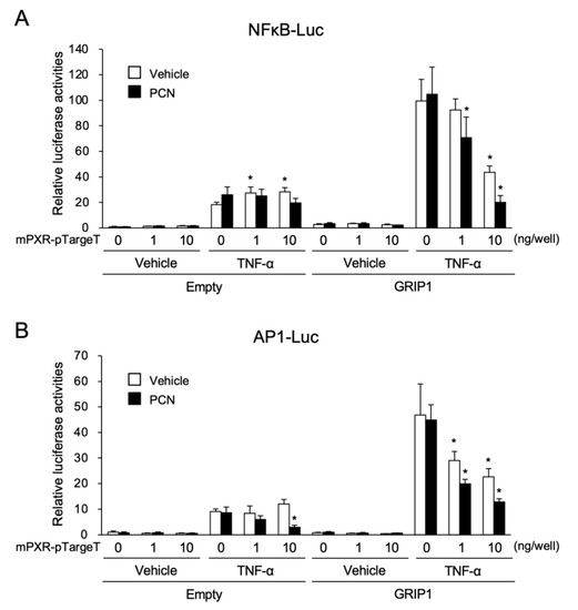 Finally, to further confirm the suppressive effects of ligand-activated PXR on the transactivation by NF-κB and AP-1, reporter assays were performed using a reporter construct containing consensus NF-κB (5′-GGGAATTTCC-3′) or AP-1 (5′-TGACTAA-3′) binding motifs (Figure 6A). As GRIP1, a transcriptional coactivator, was recently reported to enhance gene transcription by NF-κB or AP-1 [17], we expressed GRIP1 in this system (Figure 6A, right). With the reporter plasmid containing NF-κB binding motifs, the luciferase activity was increased via TNF-α treatment by approximately 18- and 35-fold in the absence and presence of GRIP1, respectively, and the increase was substantially suppressed by mPXR expression with PCN treatment in the presence of GRIP1. Similarly, the reporter activity of the construct with AP-1 binding motifs showed significant increases by PMA treatment, which was approximately 9- and 44-fold in the absence and presence of GRIP1, respectively, and the increase was considerably suppressed by mPXR expression and PCN treatment both with and without GRIP1. These results imply that mPXR can compete with NF-κB and AP-1 for GRIP1 binding and suppress their transcriptional activity.