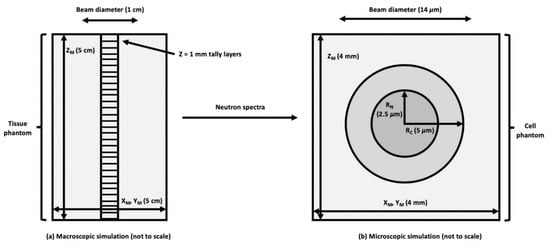 The neutron capture ion algorithm (NCIA) model was enabled by setting the 7th entry on the PHYS:N entry to 4 in MCNPX; this allowed for the production of ions from the n(10B, α)7Li reaction as well as enabling light ion recoil physics. This setting accounts for the ionization potential and uses the proper two-body kinematics to bank recoil particles with the proper energy and angle. Simulations were performed with a proton, alpha and heavy ion cutoff energy of 1 keV (lowest allowed by the code) and the Vavilov energy straggling model with the finest-allowed energy resolution in stopping power (efac = 0.99). CEM03 and LAQGSM models were selected over the default physics in the LCA entry, as recommended in the User’s Manual [37] and the neutron cross-section data used are primarily from ENDF/B-VII.0. Energy deposition tallies (F6) were set up for all charged particles of interest (all possible secondary ions from neutrons and photons) to determine the physical and biological dose. Additionally, modified F6 tallies were set up with dose response functions that relate particle energy to DNA and cellular damage, as discussed in Section 2.2 and Section 2.3.