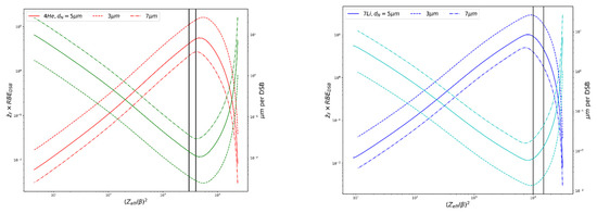 Plot of RBEDSB (relative DSBs per track), red and dark blue, and μm per DSB, green and light blue, vs. (Zeff/β)2 for alpha particles and 7Li ions, illustrating the particle-specific maximum DSB per track and minimum distance between DSBs, formulas used are described in [20]. d = nucleus (target) diameter. Vertical lines bracket the ion energies relevant to BNCT.
