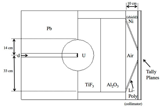 The neutron fluence in the MIT-FCB source corresponds to a reactor power at 5 MW, which produces ~3 × 109 n cm−2 s−1 epithermal (0.5 eV–10 keV) fluence [9]. Spectral data for this fission source were acquired from literature [47] without the need for additional modeling of the MIT-FCB beam. D-T sources were a major focus of interest due to their compactness, lower cost, and greater feasibility in a hospital setting than a reactor-based neutron source. Rasouli and Masoudi [43] proposed using a fissionable material as a neutron multiplier, effectively increasing the number of neutrons emitted from the D-T neutron generation. Their work built on the initial work of Verbeke et al. [48] on D-T and D-D neutron sources. The proposed beam shaping assembly (BSA) uses a combination of TiF3, Al2O3 as moderators, Pb as a reflector, Ni as a shield and Li-Poly (Lithiated Polyethylene) as collimation. This BSA combination was reproduced in MCNPX with two tally planes past the aperture to record the neutron spectrum and flux, as seen in Figure 3. Neutrons produced by D-T reaction of this source vary around 14.1 MeV by only ±7% [43], thus, it is assumed that neutrons are emitted isotropically and monoenergetically from the target in this model.