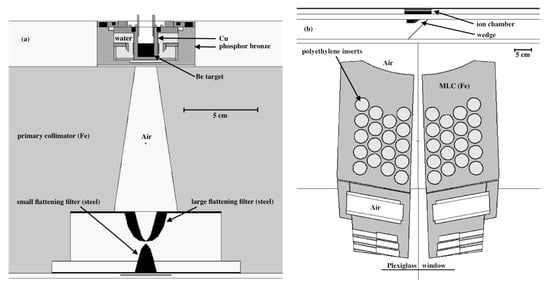 In the UW CNTS, fast neutrons are produced by 50.5 MeV protons incident on a 10.5 mm thick beryllium target, primarily through (p, n) and (p, n + p) reaction, but a small portion are created through (p, 2n), (p, 3n), and (p, n + α) reactions [19]. The incident proton beam was modeled in MCNP6 as a monoenergetic, monodirectional disk source of 0.5 cm radius, uniformly sampled. The beam originates in the vacuum above the beryllium target. Neutrons and photons are transported through the geometry as illustrated in Figure 4 and tallied in a volume of air below the target housing. The neutron spectrum and fluence at this point is recorded in a phase space file, using an SSW entry in MCNP6, and then transported as a secondary source through the multileaf collimator (MLC) (Figure 4b) and then into a water or tissue phantom. All of the simulations reported in this work are for an open 10.4 × 10.3 cm2 field at a depth of 1.7 cm in water, no wedge, small flattening filter, 148.5 cm source to surface distance or SSD.