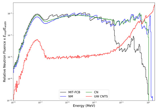 Comparison of the MIT-FCB, NM, CN and UW CNTS relative neutron fluence at a depth of 1.5 cm in a water phantom (geometry in Figure 1) obtained using MCNPX.