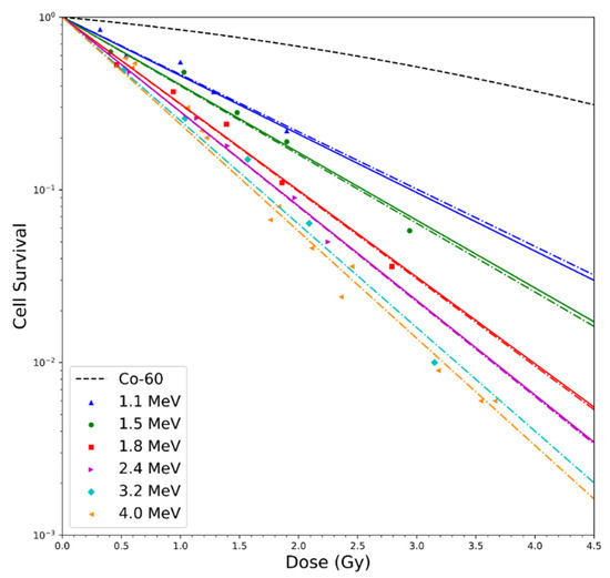 Comparison of cell survival in V79-4 cells irradiated by low-energy alpha particles [53]. Dashed lines are LQ fits to the experimental data and solid lines are RMF estimates. For 1.1 and 1.5 MeV (blue and red lines), is obtained from MCDS + MCNP simulations, for 1.8 and 2.4 MeV (red and magenta lines), is obtained from an RMF fit.