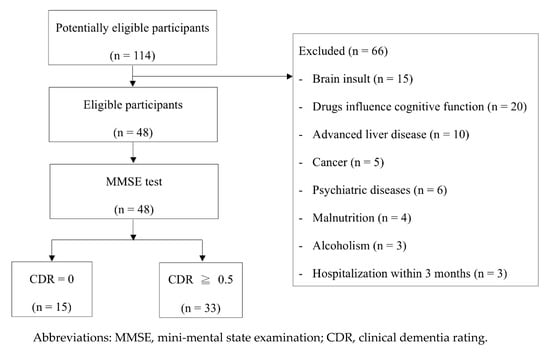 The study period was from 2015 to 2017. Patients who received regular outpatient hemodialysis at Kaohsiung Chang Gung Memorial Hospital in Taiwan were enrolled. The inclusion criteria were (1) age ≥ 18 years; (2) subjective memory complaints; and (3) ability to provide basic interview, meaning no aphasia. The exclusion criteria included (1) history of cerebral stroke or brain injury by nonmedical causes; (2) drug-usage history, which may influence cognitive function, including chemotherapy; (3) other comorbidities, which may affect cerebral function, e.g., liver cirrhosis, cancer, and psychiatric diseases; (4) malnutrition, serum albumin level <3.5 g/dL; (5) alcoholism; (6) pregnancy; (7) hospitalization within 3 months of enrollment; and (8) absence of caregiver for providing medical history. All of the participants underwent hemodialysis thrice weekly with dialyzers of surface area ≥2.0 m2 and bicarbonate-based dialysate. A total of 114 potentially eligible hemodialysis patients were screened. Finally, a total of 48 patients receiving hemodialysis were enrolled for analysis (Figure 1). The study protocol was approved by the Committee on Human Research at Kaohsiung Chang Gung Memorial Hospital (number: 104-2572B). Written informed consent was obtained from participants. The study was conducted in accordance with the Declaration of Helsinki.