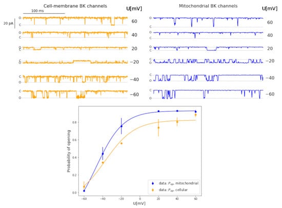 Our results confirm that the electrophysiological features of different BK channel isoforms stay in a qualitative agreement with each other, both channels are regulated by membrane potential and Ca concentration. Nevertheless, BK channels from the plasma membrane and their mitochondrial counterparts exhibit different sensitivity to calcium ions quantitatively. Namely, the mitoBK channels are significantly less sensitive to Ca ions than the cellular ones. The application of the Ca concentration of 200 M in case of mitoBK and ca. 18 M for their cellular analogs imposes a similar level of activation of the calcium sensors for both channel variants and, in consequence, allows to observe a possibly close variability of open state probability at the same range of membrane potential. For both analyzed groups of BK channels, the open state probability increased from below 0.1 to over 0.9 at the applied membrane potentials from −60 mV to 60 mV.