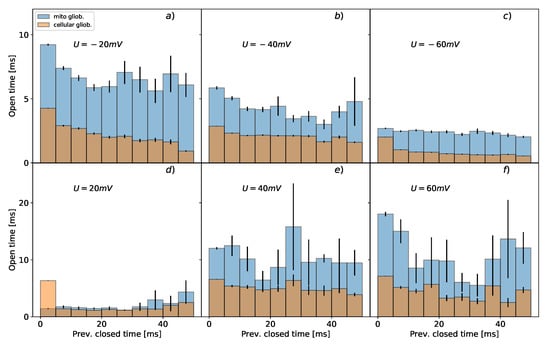 The results of the conditional dwell-time duration distributions differ for the mitochondrial and cellular channels (Figure 2 and Figure 3). The open and closed time distributions differ on all positions of the preceding dwell-time for membrane potentials of mV, mV, and mV. For positive membrane potentials, the differences are at more than of considered positions. A general feature of the durations of mitochondrial channel states is that they can reach a longer lifespan than the ones describing the dynamics of channels within the cell membrane. The statistically significant differences between the distributions of dwell-time durations of mitochondrial and cellular BK channels’ states were identified for all membrane potentials except the open state at mV (p = 0.143) (Figure 3) and mV in the case of the mean closed dwell-time duration (p = 0.089) (Figure 2).