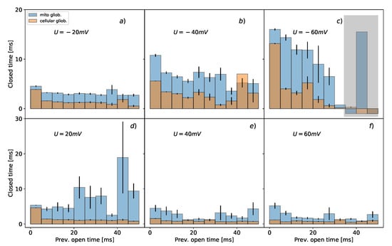 Mean conditional dwell-times of closed states presented with error bars representing the corresponding standard deviations. The blue bars characterize the conditional mean dwell-times for mitochondrial channels; the orange bars are assigned to the data describing BK channels from plasma membrane. The upper panels (a–c) present the results obtained at membrane hyperpolarization; the lower graphs (d–f) correspond to channel characteristics at membrane depolarization. The durations of closed states taking the value −1 (see gray rectangle) are assigned when a given previous length of open dwell-time was not recorded within a whole population of channel states.