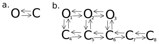 To understand (without going into too many details) the meaning of the above analysis, let us consider some simple gating models. What is here well worth mentioning, the simplest possible description of the channel kinetics by a two-state Markovian model (see Figure 4a) is not able to describe any correlations between the dwell-times of channel states. The correlations can arise when channel kinetics is modeled by at least two substrates within the manifolds of open and closed channel states, and the open and closed states of the different average lifetime are connected to each other [63,64]. This can be manifested in a form of loops within the kinetic scheme which is shown in Figure 4b presenting a possibly simple representation of BK channel gating by 3 open and 5 closed states at fixed experimental conditions (that kind of modeling can be further extended to multiple state Markovian models to describe broad ranges of voltage and Ca concentrations that affect gating).