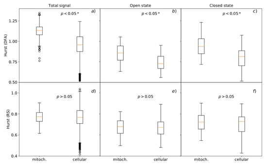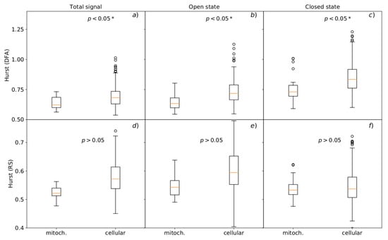 Except for one case of the mean Hurst exponent values calculated by the R/S method for the closed state (p = 0.645 for Mann–Whitney U test, see Figure 5f) all the differences were statistically significant () when one compares the dynamics of channels from mitochondrial and plasma membranes.