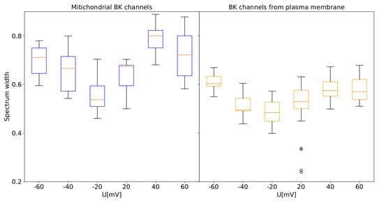 Box plots of the spectrum width obtained for the single-channel recordings for mitochondrial (blue) and cellular patches (orange) at different membrane potentials. The boxes extend from the lower to upper quartile values. The line inside the box characterizes the median value and the whiskers represent the range of data. Outlier points are those which exceed the ends of the whiskers.