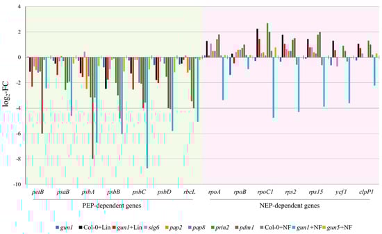 Expression analyses of a subset of PEP- and NEP-dependent plastid genes in different genetic backgrounds and after treatments that alter PEP activity. Values are expressed as the logarithm of the fold-change (log2-FC) relative to wild-type seedlings grown under optimal conditions. Data are retrieved from the literature in the case of sig6 [], pap2 and pap8 [], prin2 [], and pdm1 (pigment-deficient mutant 1) [] and from the GEO public repository in the case of gun1, Col-0 + Lin, gun1 + Lin (GEO accession GSE5770; []), Col-0 + NF, gun1 + NF, and gun5 + NF (GEO accession GSE12887;[]). Lincomycin treatment of wild-type Arabidopsis seedlings (Col-0 + Lin) leads to a drop in PEP-dependent transcript accumulation. As an adaptive response, NEP-dependent transcript levels are increased in plastids, giving rise to what is known as the “Δ-rpo phenotype”. Similar behavior is observed in mutants, such as sig6, pap2, pap8, prin2, and pdm1, which lack either nucleus-encoded plastid proteins required for PEP activity (SIG6, PAP2, PAP8, PRIN2) or mRNA maturation factors (PDM1). However, gun1 seedlings grown in the presence of lincomycin (gun1 + Lin) show an impaired “Δ-rpo phenotype”: i.e., NEP-dependent transcripts show a very limited degree of upregulation. Similarly to lincomycin, gun1 seedlings grown on norflurazon-containing medium (gun1 + NF) undergo severe repression of PEP-dependent genes, and repression is even more pronounced if NEP-dependent transcripts are considered. On the contrary, Col-0 and gun5 (genomes uncoupled 5) seedlings in the presence of norflurazon (Col-0 + NF and gun5 + NF) show a wild-type-like plastid gene expression, indicating that the drastically reduced accumulation of PEP- and NEP-dependent transcripts upon NF treatment is a characteristic of the gun1 genetic background.