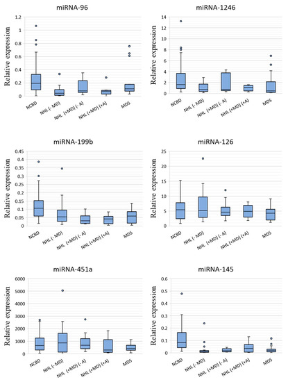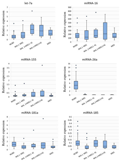 miRNA relative expression levels in non-Hodgkin’s lymphomas without myelodysplasia (NHL (−MD); n = 22), non-Hodgkin’s lymphomas with myelodysplasia and without anemia (NHL (+MD) (−A); n = 11), non-Hodgkin’s lymphomas with myelodysplasia and anemia (NHL (+MD) (+A); n = 8) and myelodysplastic syndrome (MDS; n = 19) against non-cancerous blood diseases (NCBD; n = 58). The figure presents the median value, the upper and lower quartiles, the non-outlier range and outliers appearing as the circles.