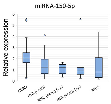 The expression levels of miRNAs were measured by RT-qPCR in the MDS, NHL (−MD), NHL (+MD) (−A), NHL (+MD) (+A) and NCBD groups (Figure 1).
