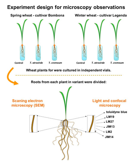 Each variant for microscopy observations were replicated from 7 to 10 plants. Roots from this same plant root system were divided—one (root hairs zone) for light and confocal microscopy. Three sections were taken for each staining. Second root (root hairs zone) were taken for scanning electron microscopy (SEM). Figure 1 shows a scheme of the experiment.