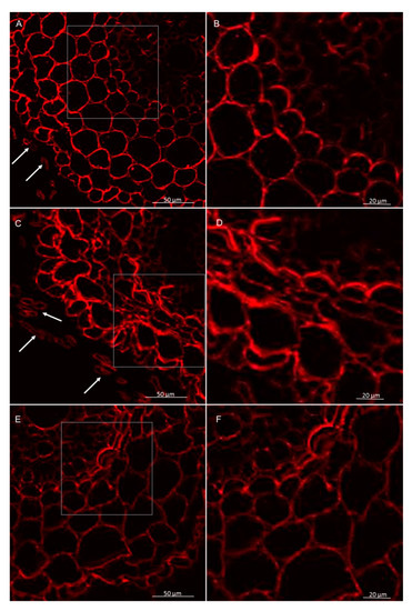 Immunolocalization of low methyl-esterified pectins LM19 epitope in roots of winter wheat (cv. Legenda): (A,B)—control roots, (C,D)—roots treated with T. atroviride AN35, (E,F)—roots treated with T. cremeum AN392. White arrows indicate pectins of LM19 epitope in intercellular spaces.