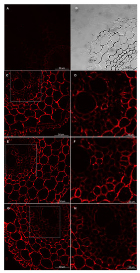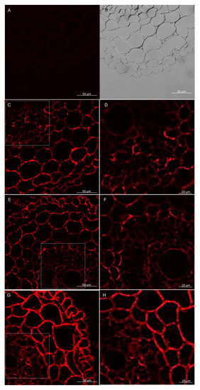 The detection process was carried out in sections using primary monoclonal antibodies—LM19 epitope (PlantProbes, Leeds, UK, Table 1) for low methyl-esterified pectins, and LM27 epitope (PlantProbes, Leeds, UK, Table 1) for grass xylan hemicelluloses. The arabinogalactan proteins (AGPs) were detected by monoclonal antibodies—JIM13, JIM14, LM2 (PlantProbes, Leeds, UK, Table 1). The immunolabeling procedure was carried out according to Lenartowska et al. [42] with modifications. The sections on the glass slides were first blocked in 2% bovine serum albumin (BSA, Merck KGaA, Darmstadt, Germany, formerly Sigma, St. Louis, MO, USA) in PBS for 3 h and then incubated with primary monoclonal antibodies overnight, diluted 1:20, washed 3 times with PBS buffer and incubated with goat anti-Rat IgG (H+L) cross-adsorbed secondary antibody—diluted in 1:100 conjugated with Cy3 (A10522, Thermo Fisher Scientific, Waltham, MA, USA, excitation: 550 nm, emission: 570 nm) for 1.5 h. In the end, the sections were washed 3 times with PBS buffer and 4 times with deionized water. The samples were coated with Citifluor™ AF1 (Electron Microscopy Science, Hatfield, PA, USA), closed with cover glass, and protected by nail polish. Observations were carried out using a confocal microscope (Olympus FV1200, Tokyo, Japan).