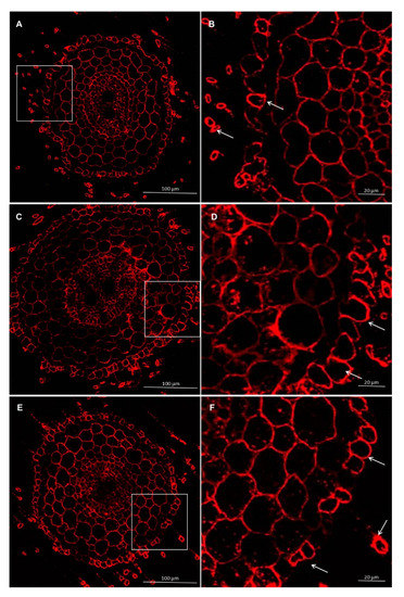 Immunolocalization of low methyl-esterified pectins LM19 epitope in roots of spring wheat (cv. Bombona): (A,B)—control roots, (C,D)—roots treated with T. atroviride AN35, (E,F)—roots treated with T. cremeum AN392. White arrows indicate pectins of LM19 epitope in intercellular spaces and cell wall thickening of the cells.