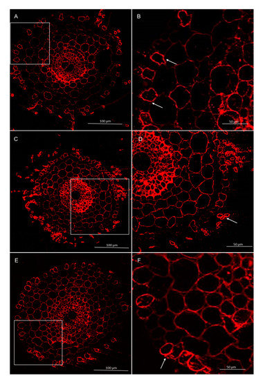 Immunolocalization of xylan LM27 epitope in roots of winter wheat (cv. Legenda): (A,B)—control roots, (C,D)—roots treated with T. atroviride AN35, (E,F)—roots treated with T. cremeum AN392. White arrows indicate root hairs.