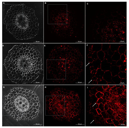 Immunolocalization of arabinogalactan proteins (AGPs) JIM14 epitope in roots of spring wheat (cv. Bombona): (A–C)—control roots, (D–F)—roots treated with T. atroviride AN35, (G–I)—roots treated with T. cremeum AN392. White arrows indicate JIM14 epitope in parenchyma and rhizodermis cells.