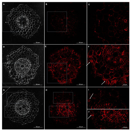 Immunolocalization of arabinogalactan proteins (AGPs) JIM14 epitope in roots of winter wheat (cv. Legenda): (A–C)—control roots, (D–F)—roots treated with T. atroviride AN35, (G–J)—roots treated with T. cremeum AN392. White arrows indicate accumulation of JIM14 epitope in rhizodermis cells.
