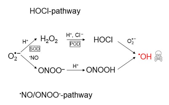 Schematic illustration of the reaction network of apoptosis-inducing signaling pathways: the hypochlorous acid- and the nitric oxide/peroxynitrite pathway. Both pathways originate from superoxide anions and result in the formation of hydroxyl radicals, which are responsible for apoptosis-induction.