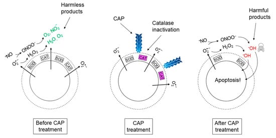 According to refs. [,,,,,,], the (selective) anti-cancer effect of CAP is due to its effect on catalase; it has been shown that singlet oxygen, which is one of the ROS known to be generated in CAP, has the potential to inactivate antioxidant enzymes, like catalase [,]. Thus, CAP may be used as a source of external so-called “primary” singlet oxygen to inactivate the protective membrane-associated catalase in cancer cells. Applying CAP on tissue containing cancer cells will hence cause selective elimination of cancer cells through reactivation of hydroxyl radical generation from the hypochlorous acid-and the nitric oxide/peroxynitrite pathway in the extracellular compartment of these cells. A simplified cartoon picture of the total chain of events presented in Section 2.1, Section 2.2 and Section 2.3, can be seen in Figure 3.