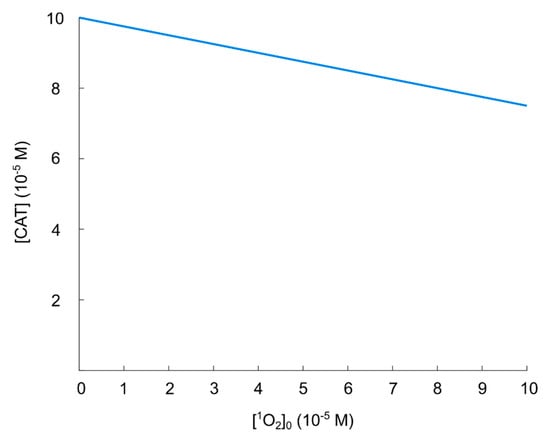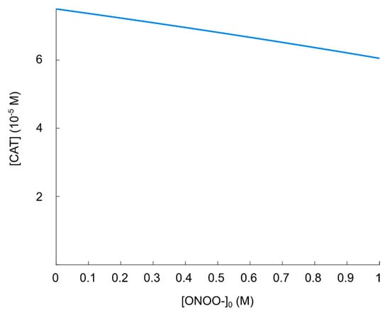 Regarding the nitric oxide/peroxynitrite pathway alone (i.e.,) the only enzyme-catalyzed reaction (with catalase) is not given as a Michaelis–Menten mechanism (see []), so in this case, it should be feasible to use the physically maximal concentration of catalase as(see Section 3.1) to explore the whole regime of possible catalase concentrations. We thus use the concentration of catalase when the whole extracellular compartment is maximally filled with catalase as our default reference value. This concentration is found in the same manner as in the case of SOD. The radius is now(see Appendix A.2), which yield. Like in the case of SOD, this does obviously not correspond to a realistic scenario since there will be no space for the molecules to collide, but in lack of an experimental value of the true catalase concentration, we wish to explore the whole regime of physically possible catalase concentrations.