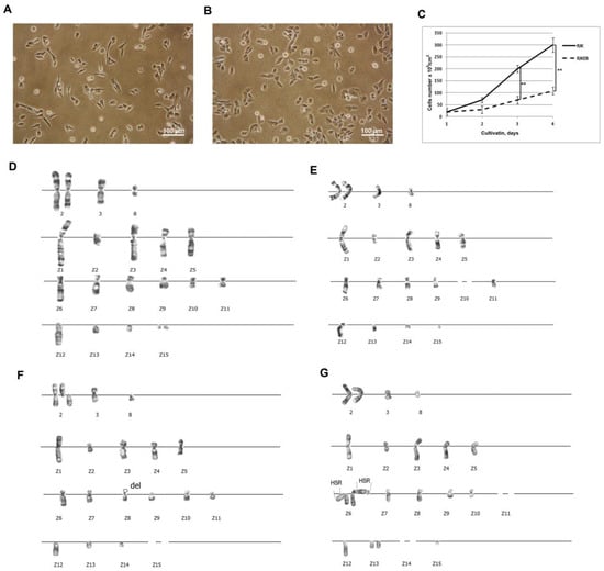 Characteristics of RJK and RJKEB cells. (A) RJK cells, live imaging, Ob: 10×; (B) RJKEB cells, live imaging, Ob: 10×; (C) RJK and RJKEB growth curves. To plot cell growth curves, the number of RJK and RJKEB cells was counted using FACS analysis for 4 days. The mean ± SD of three independent experiments (** p ˂ 0.01); (D) standard RJK karyotype. 2, 3, 8—normal chromosomes. Z1-Z15—marker chromosomes. n = 20; (E) RJK karyotype with loss of chromosome Z10, n = 18; (F) karyotype with centromeric break in chromosome 2, del p terZ8, chromosome Z15 is absent. n = 18; (G) karyotype of RJKEB cells. A cell variant with two copies of the Z6 chromosome labeled with HSR of different lengths. Chromosomes Z11 and Z15 are absent. n = 18. Ob: 100×. Abbreviations: RJK—Chinese hamster cells CHLV-79 RJK; RJKEB—RJK resistant to ethidium bromide; FACS—fluorescence-actevated cell sorting; del—deletion; p—short chromosome arm; q—long chromosome arm; n—number of chromosomes in the karyotype; HSR—homogeneously stained region.