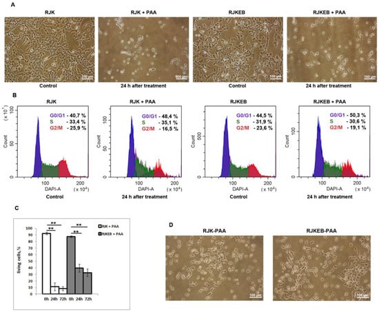 3.2. Morphology and Proliferative Features of RJK and RJKEB Cells after Exposure to PAA