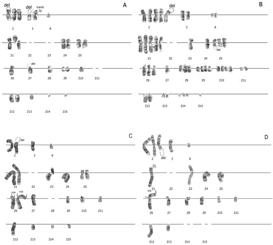 Changes in the karyotype of RJK and RJKEB cells survived after exposure to PAA. (A) Aneuploid RJK-PAA karyotype with 3 copies of chromosome 2; chromosomes—3, Z1, Z4, Z5, Z9, Z12—2 copies; lack of chromosomes Z2, Z3, Z11; del 2p ter (in one copy) and del Z7 pter (in one copy), del 3p (in one copy, tr 3p: 3p ter (in another copy). n = 23. (B) Aneupolyploid RJK-PAA karyotype, chromosome Z2 is missing; centromeric breaks in one copy of chromosome Z1 (p-arm, q-arm, in one copy); del 2p ter (in one copy) and delZ5qter (in two copies). n = 44. (C) Aneuploid RJKEB-PAA karyotype with impaired copying of chromosomes Z1, Z5, Z6; lack of chromosomes Z2, Z8; centromeric breaks in Z3 chromosome (p-arm, q-arm), the presence of HSR of different lengths in Z6. n = 20. (D) Aneuploid RJKEB-PAA karyotype with impaired copy number of chromosome 2 (3 copies), lack of chromosomes Z2, Z14, Z15; del 2q—ter (in one copy), break in Z1 pter. n = 17. Abbreviations: RJK—Chinese hamster cells CHLV-79 RJK; RJKEB—RJK resistant to ethidium bromide; PAA—polyallylamine hydrochloride; RJK-PAA—RJK cells after PAA treatment; RJKEB-PAA—RJKEB cells after PAA treatment; EB—ethidium bromide; del-deletion; ter-terminal end of the chromosome; p—short arm of the chromosome; q—long arm of the chromosome; n—number of chromosomes in the karyotype; HSR—homogeneously stained region.