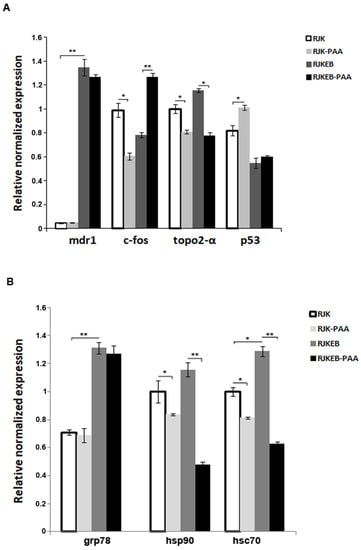 Gene expression on RJK and RJKEB cells survived after PAA exposure. (A) qRT-PCR analysis of the gene mdr1, c-fos, topo2-α, p53 level in RJK, RJK-PAA, RJKEB, RJKEB-PAA cells. (B) qRT-PCR analysis of the gene grp78, hsp90, hsc70 level in RJK, RJK-PAA, RJKEB, RJKEB-PAA cells. The mean ± SD of three independent experiments are presented (* p < 0.05; ** p ˂ 0.01). Abbreviations: RJK—Chinese hamster cells CHLV-79 RJK; RJKEB—RJK resistant to ethidium bromide; PAA—polyallylamine hydrochloride; RJK-PAA—RJK cells after PAA treatment; RJKEB-PAA—RJKEB cells after PAA treatment; EB—ethidium bromide; qRT-PCR—quantitative reverse transcription polymerase chain reaction.