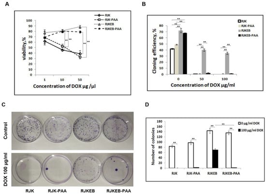 Viability of RJK, RJK-PAA, RJKEB, RJKEB-PAA cells after treatment with various doses of DOX. (A) Viability of RJK, RJK-PAA, RJKEB and RJKEB-PAA treated with DOX for 24 h. MTT assay. (B) The cloning efficiency of RJK, RJK-PAA, RJKEB, RJKEB-PAA after DOX treatment. (C) Petri dishes with colonies of RJK, RJK-PAA, RJKEB, RJKEB-PAA cells stained with crystal violet dye. (D) Quantitation of colonies in RJK, RJK-PAA, RJKEB, RJKEB-PAA cultures after DOX treatment. The mean ± SD of three independent experiments are presented (** p ˂ 0.01). Abbreviations: RJK—Chinese hamster cells CHLV-79 RJK; RJKEB—RJK resistant to ethidium bromide; PAA—polyallylamine hydrochloride; RJK-PAA—RJK cells after PAA treatment; RJKEB-PAA—RJKEB cells after PAA treatment; EB—ethidium bromide; DOX—doxorubicin.