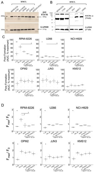 Expression and functionality of P2X7 receptor in RPMI-8226, U266, NCI-H929, OPM2, JJN3, and KMS12 human multiple myeloma cell lines (HMCLs). (A) Semi quantitative RT-PCR shows the P2X7 receptor mRNA expression in all HMCLs. Positive control was HEK293 cells stably transfected with P2X7 receptor, negative control (–) was a no template PCR reaction, and GAPDH expression corresponding to the same RT-PCR reaction was used as loading control. (B) Whole-cell lysates were immunoblotted with monoclonal antibody P2X7R-ec (raised against the extracellular domain of P2X7), and GAPDH (bottom panel) was the loading control. (C) Pore formation shown as area under the curve (AUC), with 500 µM 2′(3′)-O-(4-benzoylbenzoyl) adenosine 5′-triphosphate (BzATP) stimulus alone or in the presence of 10 µM P2X7 receptor antagonists (KN62, A740003, or AZ11645373), as indicated. Data are expressed as percentage of cell lysis (% maximum), achieved with injecting lysis reagent to each well at the end of measurement, and shows mean ± SEM of 6–9 independent experiments (n) with six replicate measurements per treatment (n = 2–4 with antagonists). * = p < 0.05, ** = p < 0.01, Kruskal–Wallis comparison with multiple corrections of each treatment to 500 µM BzATP. (D) Influx of Ca2+ evoked by 100 µM BzATP stimulus alone or in the presence of 1 µM P2X7 receptor antagonists (KN62, A740003, or AZ11645373), as indicated. Data are expressed as cytosolic [Ca2+] measured by peak fluorescence (Fmax) as a change from baseline (before stimulus, F0) and shows mean ± SEM of 5–7 independent experiments (n) with four replicate measurements per treatment (n = 2–5 with antagonists). * = p < 0.05, Kruskal–Wallis comparison with multiple corrections of each treatment to 100 µM BzATP.