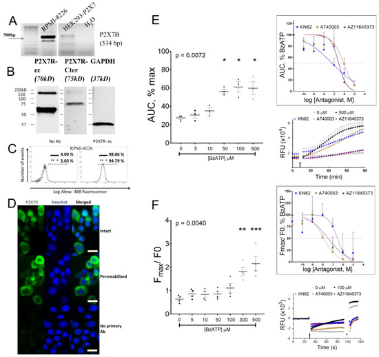 Characterization of P2X7 receptor in RPMI-8226. (A) Semi quantitative RT-PCR shows the transcript for truncated variant of P2X7 receptor compared to HEK293 cells stably transfected with P2X7 receptor used a positive control. (B) Whole-cell lysates were immunoblotted with antibody P2X7R-Cter (specific to the A isoform), showing a positive but lower intensity band compared to the P2X7R-ec (common to both A and B isoforms); GAPDH (right panel) was the loading control. (C) Histograms from flow cytometric analysis of intact (solid line) and permeabilized (dotted line) RPMI-8226 stained with monoclonal antibody P2X7R-ec or negative control (no Ab) with only secondary antibody to show percentage of positive cells (horizontal bar). (D) Microscopic images of RPMI-8226 stained with monoclonal antibody P2X7R-ec when intact (top), permeabilized (middle), and with no primary negative control (bottom). Hoescht was used to stain cell nuclei; scale bar 10 µm. (E) YO-PRO-1 uptake with increasing doses of BzATP shown as area under the curve (AUC) of maximum (cell lysis), and (inset) with 500 µM BzATP against increasing doses of antagonists (KN62, A740003, or AZ11645373). Injection trace of YO-PRO-1 uptake with BzATP (arrow marking the injection point) in the presence or absence of 1 µM KN62, 1 µM A740003, or 1 µM AZ11645373. Data shows mean ± SEM of three independent experiments (n) with six replicate wells per treatment (n = 2 with 6 replicate wells of each antagonist concentration) and * = p < 0.05, Kruskal–Wallis comparison with multiple corrections of each treatment to 0 µM BzATP. (F) Influx of Ca2+ evoked by increasing doses of BzATP, shown as peak fluorescence (Fmax) as a change from baseline (before stimulus, F0), and (inset) by 100 µM BzATP against increasing doses of antagonists (KN62, A740003, or AZ11645373). Injection trace of relative fluorescence (arrow marking the injection point; ionophore was used for full response shown at dotted arrow) in the presence or absence of 1 µM KN62, 1 µM A740003, or 1 µM AZ11645373. Data shows mean ± SEM of four independent experiments (n) with three replicate wells per treatment (n = 2 with duplicate wells of each antagonist concentration) and ** = p < 0.01, *** = p < 0.001, Kruskal–Wallis comparison with multiple corrections of each treatment to 0 µM BzATP.