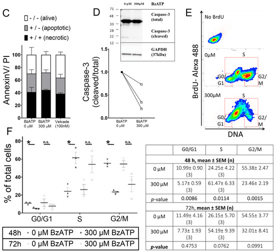 P2X7 receptor induced cell cycle arrest but not apoptosis in RPMI-8226. (A) Viability as a measure of metabolically active and (B) DNA content (pg/well) of RPMI-8226 cells after 48 h with BzATP is plotted as a percentage of control (0 µM BzATP, dotted line). Velcade (100 nM), an anti-myeloma agent, was used as a positive control. Data shows mean ± SEM of three independent experiments; Kruskal–Wallis comparison to show * = p < 0.05 multiple corrections of each treatment to 0 µM BzATP (# = p < 0.05, ### = p < 0.001 Mann–Whitney test for 0 µM BzATP vs. Velcade). (C) Flow cytometry to assess the percentage of alive (annexin V-/PI-), apoptotic (annexin V+/PI-), and necrotic (annexin V+/PI+) cells after 48 h with 300 µM BzATP. Data shows mean ± SEM of four independent experiments. (D) Western blot analysis to quantify caspase-3-cleaved protein (17 kDa) as a ratio of total protein (35 kDa) after 48 h with 300 µM BzATP; GAPDH was probed as a loading control (n = 3). (E) Scatter diagrams representing the populations in G0/G1, S, and G2/M phases of the cell cycle as determined by flow cytometry and (F) analysis following a 2-h BrdU pulse showing the percentage of cells in each cell cycle phase after 48 and 72 h treatment with 300 µM BzATP. Data shows mean ± SEM of three independent experiments, where * = p < 0.05 by Mann–Whitney test compared to 0 µM BzATP in the corresponding cell cycle phase.
